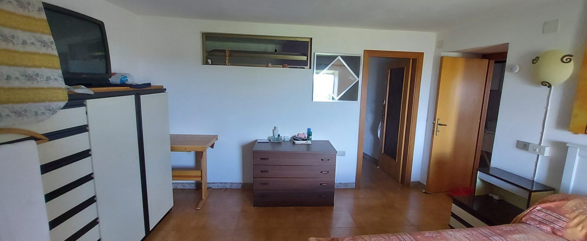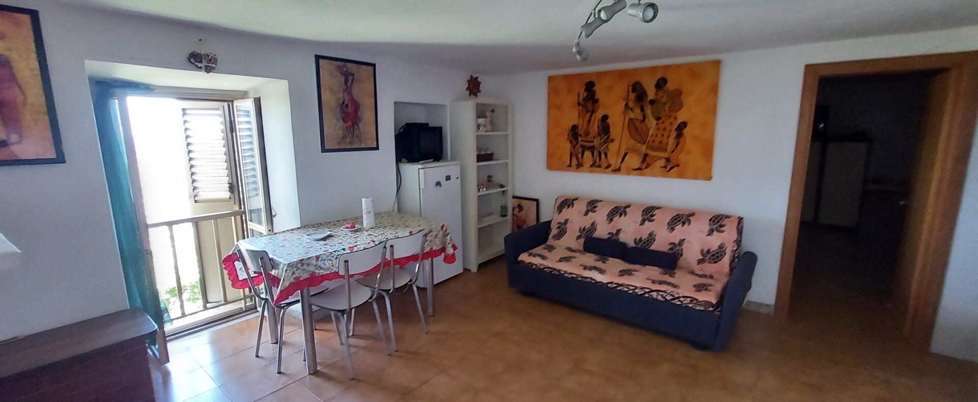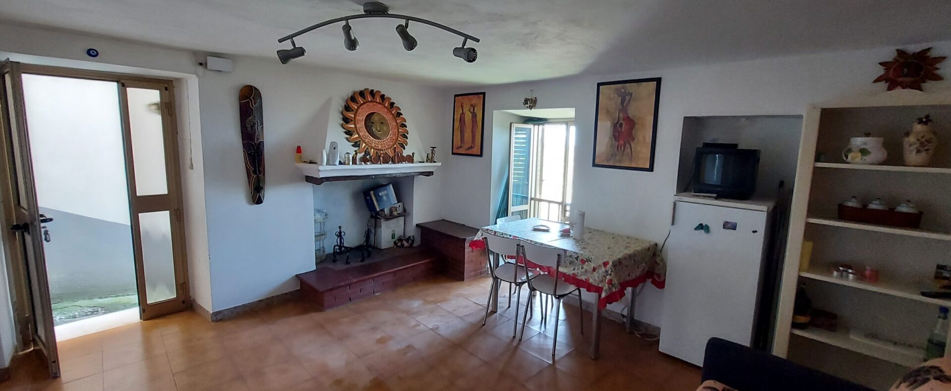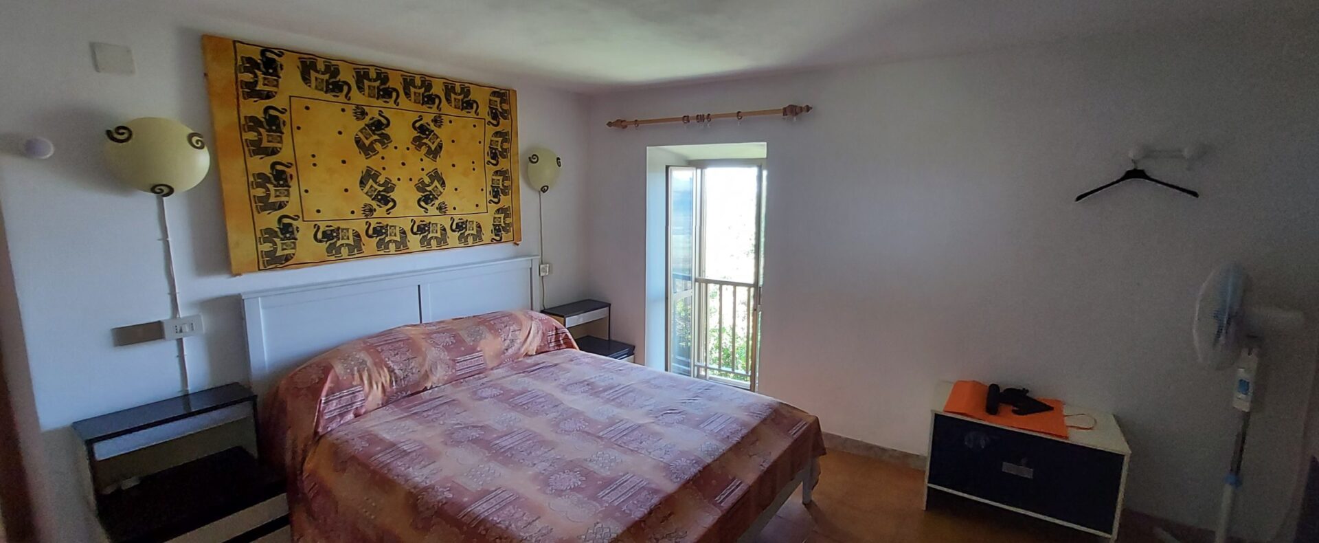 There is an open space with a small kitchenette, fireplace and a nice balcony overlooking a breathtaking view, a bathroom with shower, a double bedroom with another panoramic balcony and a large closet