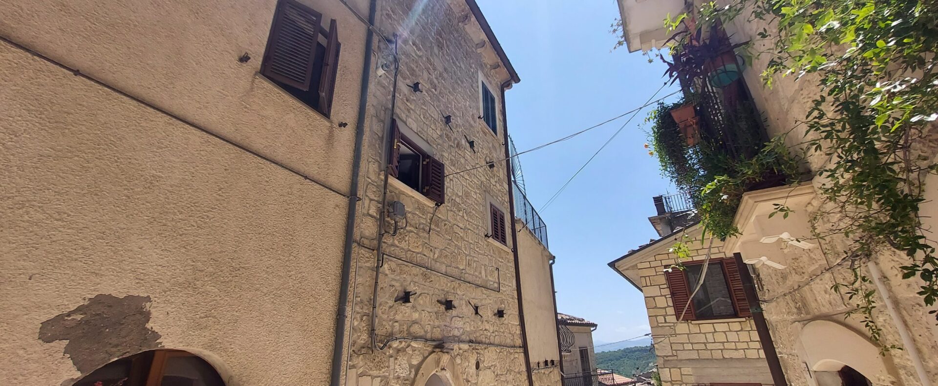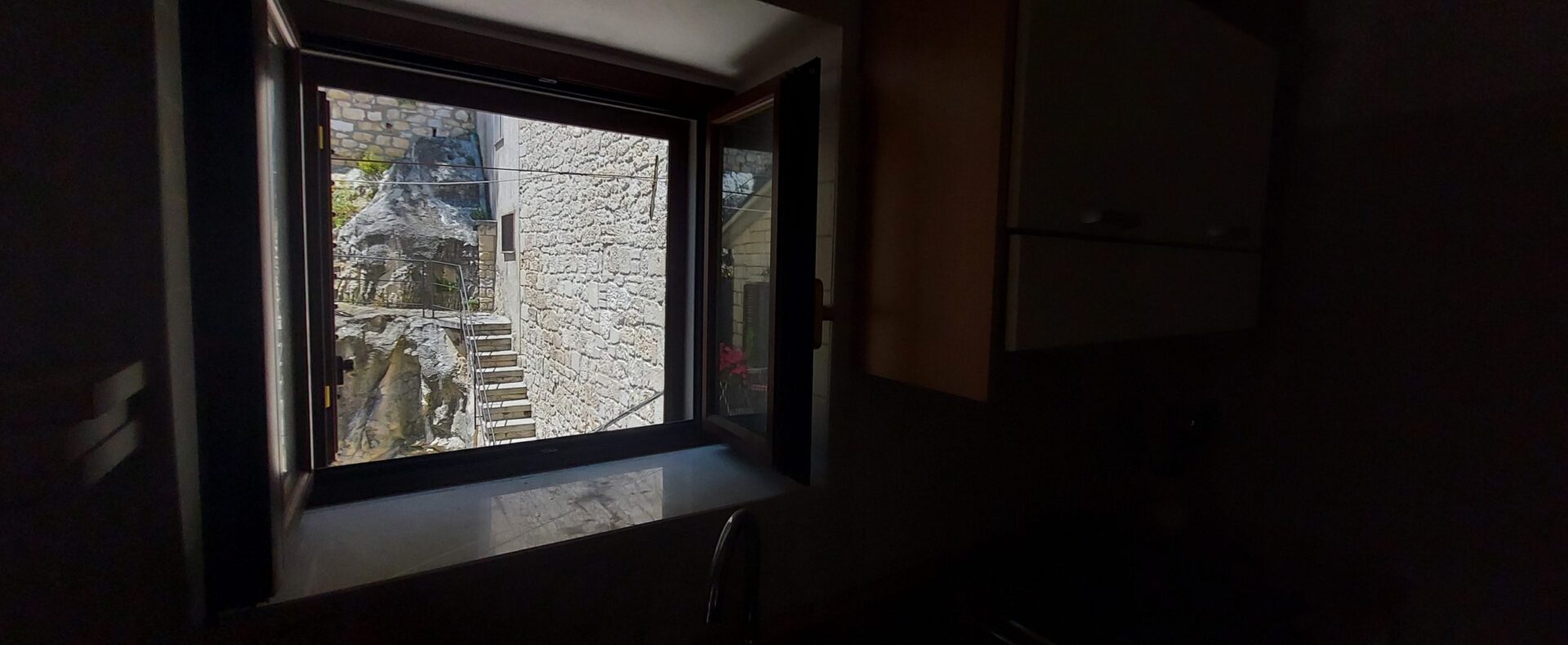 The house is located on the first floor of a completely renovated building with exposed stone